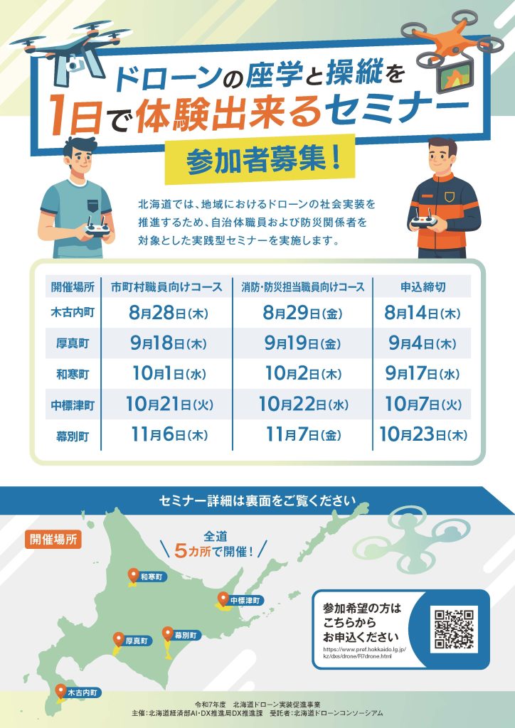弊社は北海道ドローンコンソーシアムとして北海道経済部AI・DX推進局DX推進課と共にドローンの座学と操縦を1日で体験出来るセミナーを開催します!(※自治体職員対象)