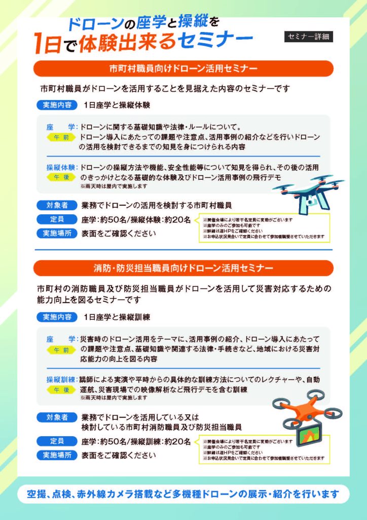 ※各コースとも座学定員50名程度、操縦体験20名程度とさせていただき、お申込多数の場合は、各自治体・消防本部あて別途連絡をさせていただきます。