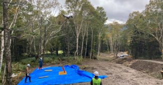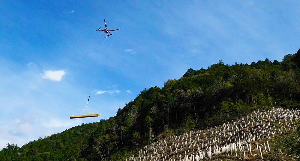 林業用ドローンはこれまで重労働だった苗木運搬の効率化と省力化を実現するもので、林業分野で大きな懸案事項となっている再造林時の人手不足や高齢化に貢献するとしている。森林でドローンを使用するために、専用ウインチを搭載、自動切離しフックや共振防止装置を開発したことで、安全を確保しながらも広範囲に渡る作業も効率よく速く進めることができます。
